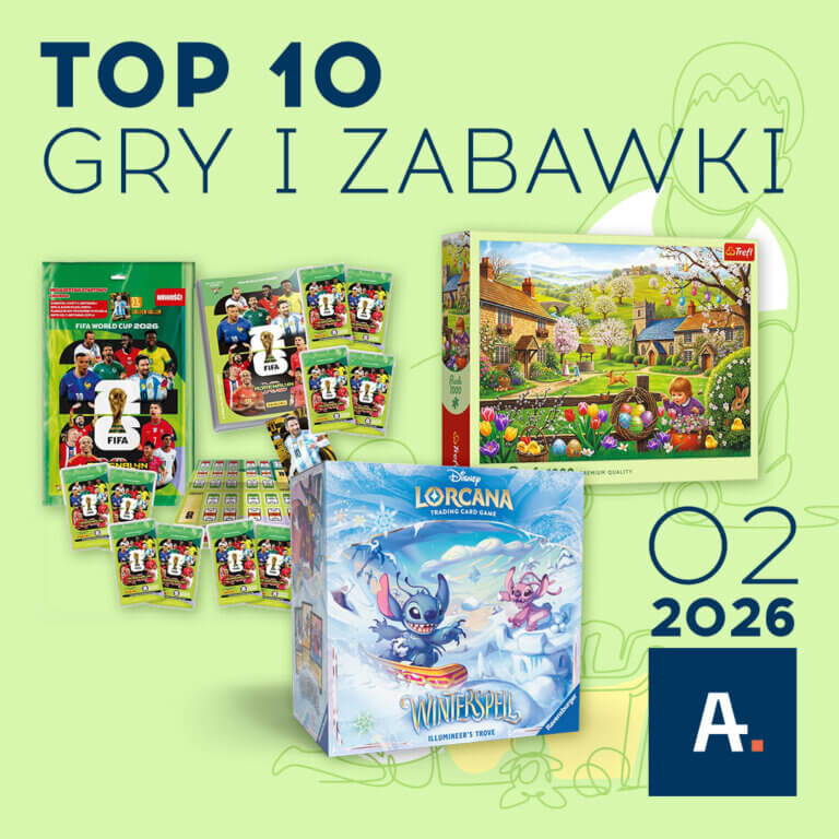 Wśród gier i zabawek na czele zestawienia znalazł się zestaw kolekcjonerski FIFA World Cup 2026 Adrenalyn XL megazestaw startowy od Panini, który potwierdza niezmienną popularność produktów związanych z piłką nożną i kolekcjonowaniem kart. Wysoką sprzedaż odnotowały również tytuły oparte na znanych markach, takie jak Disney Lorcana: Winterspell, Illuminer’s Trove od Ravensburger czy The Sims: Gra planszowa od Goliath. W zestawieniu widoczny jest także sezonowy trend wielkanocny – m.in. puzzle Puzzle 1000 el. Poszukiwanie wielkanocnych jajek od Trefla oraz gra aktywizująca Wielkanocna wyszukiwanka od Kangura.