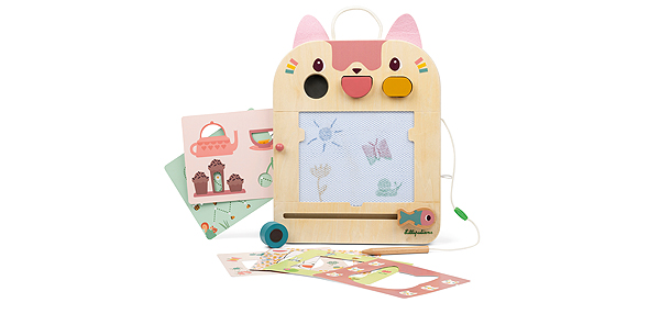 W zestawie jest 6 dwustronnych kart z propozycjami zabaw, 3 magnetyczne klocki w różnych kształtach do odciskania i odpinany rysik, którym można pisać lub rysować na tablicy. Ekran do rysowania podzielony jest na 4 kolory, aby ożywić i ubarwić rysunki. Tablicę można wyczyścić, przesuwając rybkę.