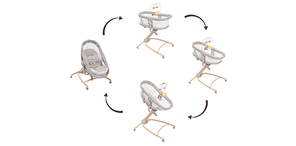 Wszechstronne i stylowe rozwiązanie. Dzięki odpowiednio dobranej kolorystyce nóg i nowoczesnym kolorom idealnie wpasowuje się w każde wnętrze. Zaprojektowany tak, aby dostosować się do rozwoju dziecka i potrzeb rodziców. Oferuje cztery różne rozwiązania: łóżeczko, leżaczek, krzesełko i fotelik.