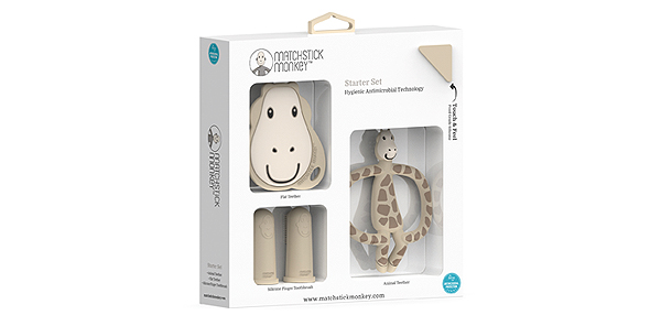 Higieniczny zestaw na ząbkowanie z powłoką BioCote redukującą 99,9% bakterii. Zawiera dwa gryzaki oraz szczoteczkę na palec. Wykonany z silikonu spożywczego, wolny od BPA, odporny na sterylizację i zmywarkę. Ergonomiczny kształt wspiera rozwój motoryki i nawyki higieniczne u niemowląt.