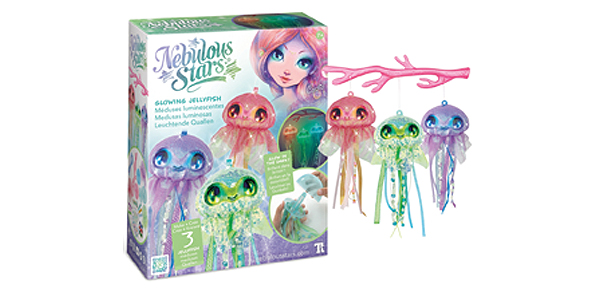 Zabawka Roku 2025 – Wyróżnienie Dzieci. Zestaw 3 świecących w ciemności meduz Nebulous Stars do samodzielnego złożenia. Kolorowe koraliki, błyszczące dodatki i wieszak-koralowiec zamienią pokój w magiczną rafę. Zestaw rozwija kreatywność, zdolności manualne i jest piękną dekoracją pokoju dziecięcego.
